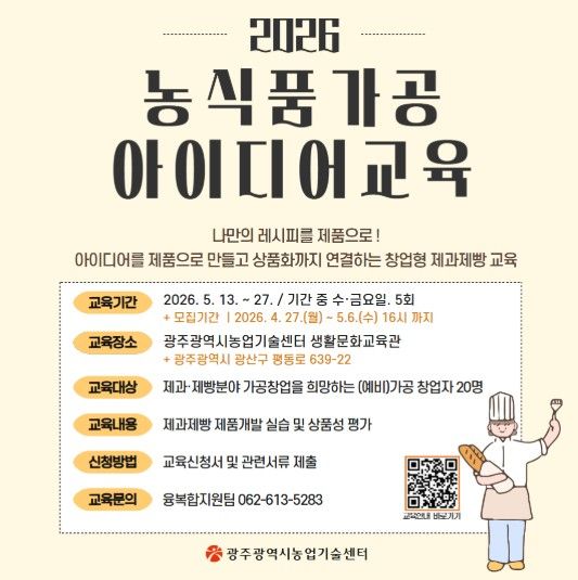 한방통신사 김성의 기자 | 광주광역시 농업기술센터는 제과·제빵 창업을 희망하는 예비창업자를 대상으로 ‘농식품 가공 아이디어 교육’을 5월 13일부터 27일까지 총 5회 과정으로 운영한다.