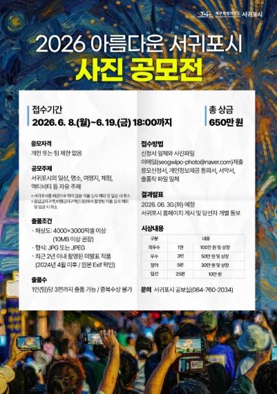 한방통신사 신유철기자 기자 | 서귀포시는 지역의 다양한 매력을 발굴하고 이를 홍보 콘텐츠로 적극 활용하기 위해 ‘2026 아름다운 서귀포시 사진 공모전’을 개최한다.