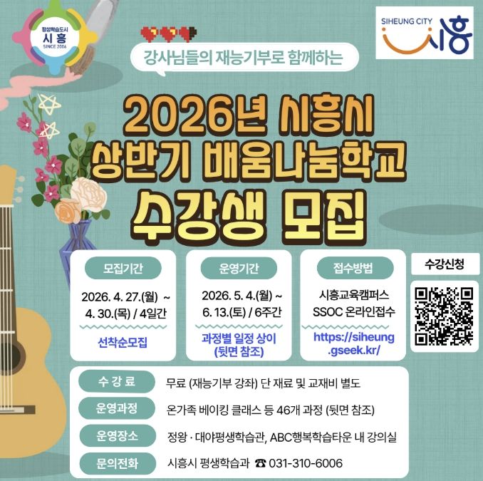 수강생 모집 기간은 4월 27일부터 4월 30일까지이며, 강좌별 모집 인원은 선착순으로 마감된다. 신청은 시흥교육캠퍼스 ‘쏙(SSOC)’을 통해 가능하며, 세부 강좌 일정과 내용은 홈페이지를 통해 확인할 수 있다.