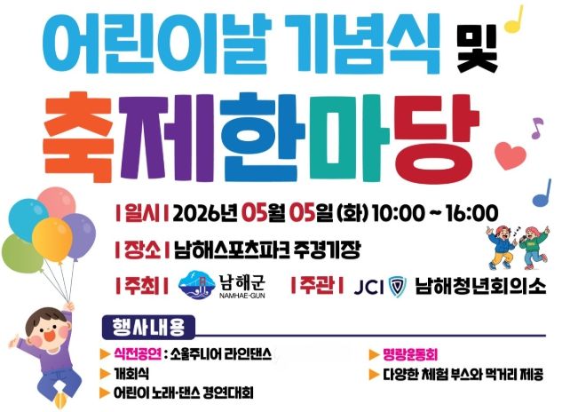 한방통신사 신유철기자 기자 | 남해군은 5월 5일 어린이날을 맞아 ‘제104회 어린이날 기념식 및 축제한마당’을 남해스포츠파크 주경기장에서 개최한다.