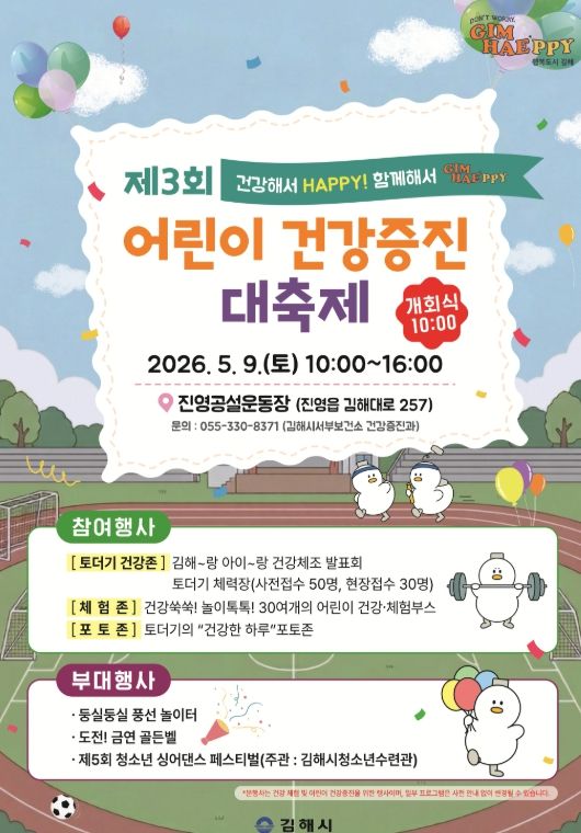 올해는 ‘건강해서 HAPPY! 함께해서 GIMHAEPPY’라는 슬로건 아래, 어린이들이 놀이와 체험을 통해 올바른 건강 습관을 형성하고 온 가족이 함께 추억을 쌓을 수 있는 다채로운 프로그램을 선보인다.