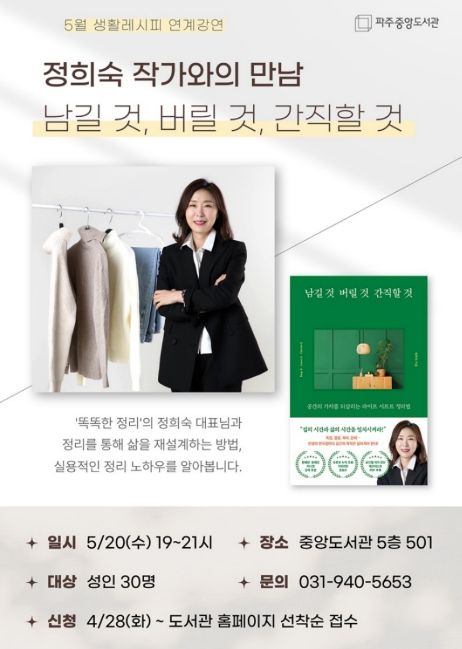 한방통신사 신유철기자 기자 | 파주시 중앙도서관은 오는 5월 20일 19시, 정리 전문가 정희숙 작가를 초청한 '남길 것, 버릴 것, 간직할 것' 강연을 개최한다.