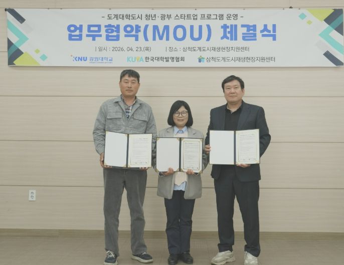 한방통신사 양호선기자 기자 | 삼척도계도시재생현장지원센터는 4월 23일 센터에서 강원대학교 도계운영본부, 사단법인 한국대학발명협회와 함께 ‘도계대학도시 청년·광부 스타트업 프로그램 운영’을 위한 업무협약(MOU)을 체결했다.