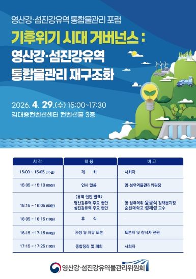 한방통신사 김성의 기자 | 영산강ㆍ섬진강유역물관리위원회는 유역 주요 물관리 현안에 대한 이해관계자 및 전문가의 다양한 의견수렴과 논의를 위하여 '기후위기 시대 거버넌스 : 영산강ㆍ섬진강유역 통합물관리 재구조화'포럼을 4월 29일(수) 김대중컨벤션센터에서 개최한다고 밝혔다.