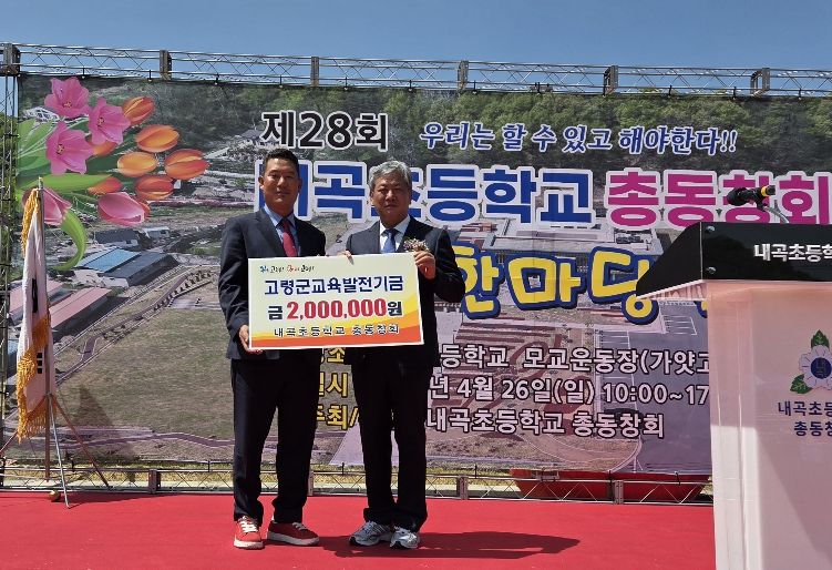 사단법인 고령군교육발전위원회(이사장 성현덕)는 지역교육 활성화를 위하여 선뜻 큰 금액을 기탁한 내곡초등학교 총동창회에 고마움을 표하고“어려운 경제여건 속에서도 교육발전을 위해 기탁해주셔서 깊이 감사드린다”며 “기탁해 주신 뜻을 소중히 받아, 우리 학생들이 보다 나은 교육환경에서 성장할 수 있도록 최선을 다하겠다”고 전했다.