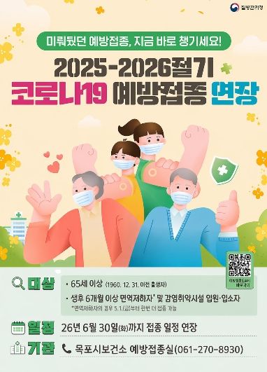 한방통신사 신다은기자 기자 | 목포시는 2025~2026절기 코로나19 예방접종사업 기간을 오는 5월 1일부터 6월 30일까지 2개월간 연장 운영한다고 밝혔다.