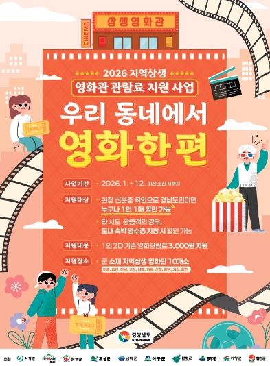 한방통신사 신유철기자 기자 | 거창군은 다가오는 5월 가정의 달을 맞이해 군민들의 문화 향유 기회를 확대하고 지역 영화관의 활성화를 돕기 위해 ‘2026년 지역상생 영화관 관람료 지원사업’을 시행한다.