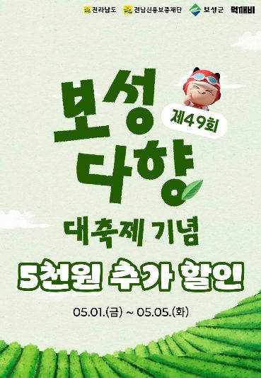 한방통신사 신다은기자 기자 | 보성군은 제49회 보성다향대축제를 맞아 5월 1일부터 5일간 공공배달앱 ‘먹깨비’를 활용한 추가 할인 행사를 진행한다고 밝혔다.