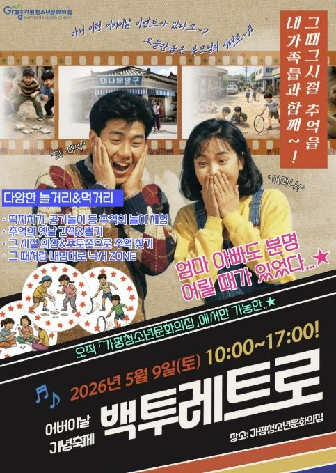 가평 군민을 대상으로 진행하는 이번 행사는 70~90년대 감성을 담은 체험과 놀이를 통해 청소년과 보호자 세대가 추억을 공유하도록 기획됐다.