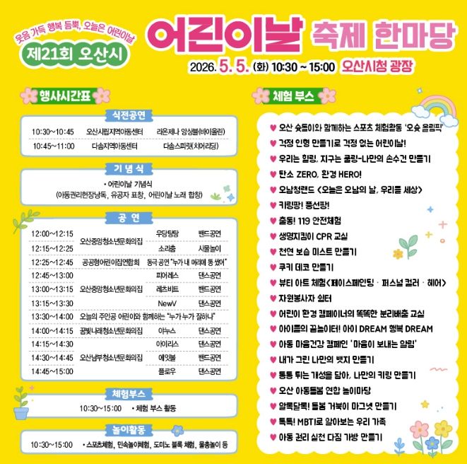 행사장에서는 오산시립지역아동센터 라온제나 앙상블과 다솜지역아동센터 다솜스피릿의 식전 공연을 시작으로 어린이날 기념식이 열린다. 이어 아동권리다짐 가방 만들기, 키링 만들기, 쿠키 만들기 등 다양한 체험부스가 운영된다.