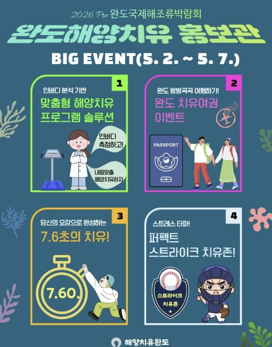 주요 이벤트로는 ▲인바디 분석을 통한 최적화된 치유 코스를 제안하는 ‘맞춤형 해양치유 솔루션’ ▲완도해양치유센터와 관내 주요 관광지 방문 스탬프를 찍어오면 선물을 증정하는 ‘완도 치유 여권 이벤트’ ▲오롯이 나에게 집중하는 시간 ‘7.6초의 치유’ ▲‘스트레스 타파! 퍼펙트 스트라이크 치유존’ 등이 있다.