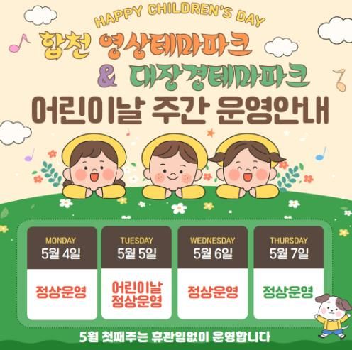 한방통신사 신유철기자 기자 | 합천군은 5월 가정의 달을 맞아 5월 첫째 주(5.4.~5.6.)동안 합천영상테마파크와 대장경테마파크를 휴관일 없이 정상 운영한다고 28일 밝혔다.