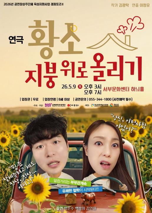 한방통신사 신유철기자 기자 | (재)김해문화관광재단 김해서부문화센터는 경남문화예술진흥원이 주관하는 ‘2026 공연장상주단체 육성지원사업’에 선정되어, 오는 5월 9일 두 번째 레퍼토리 공연 연극 '황소, 지붕위로 올리기'를 선보인다.