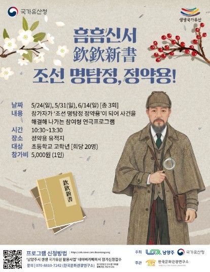 한방통신사 신유철기자 기자 | 남양주시는 오는 5월 24일과 31일, 6월 14일 정약용 유적지에서 초등학교 고학년을 대상으로 참여형 연극 프로그램 ‘흠흠신서: 조선 명탐정, 정약용!’ 참가자를 모집한다고 밝혔다.