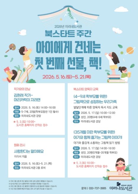 작가와의 만남과 양육자 특별 강의 신청은 5월 2일 오전 10시부터 도서관 누리집을 통해 선착순으로 접수한다. 자세한 사항은 미리내도서관 장서관리팀으로 문의하면 된다.