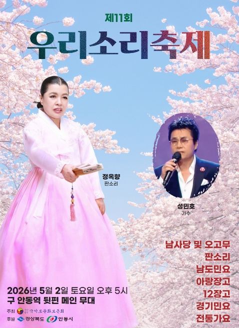 한방통신사 신유철기자 기자 | 사단법인 국악로문화보존회가 주최․주관하는 '제11회 우리소리 축제'가 오는 5월 2일 오후 5시 안동 탈춤공원 무대에서 개최된다.