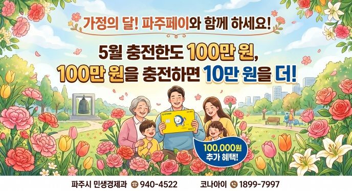 한방통신사 신유철기자 기자 | 파주시는 5월 가정의 달을 맞아 5월 1일부터 5월 31일까지 한 달간 지역화폐 파주페이의 월 충전한도를 기존 70만 원에서 100만 원으로 상향한다.