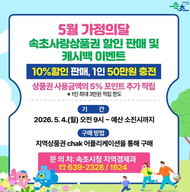 한방통신사 양호선기자 기자 | 속초시가 5월 가정의 달을 맞아 고유가 등으로 커진 가계의 경제적 부담을 덜고, 속초사랑상품권 사용 확대를 통한 지역 소비 진작에 나선다.