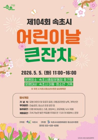 한방통신사 양호선기자 기자 | 속초시는 어린이날을 맞아 5월 5일 오전 11시부터 오후 4시까지 속초시종합경기장 인조잔디축구장에서 ‘제104회 속초시 어린이날 큰잔치’를 연다. 우천 시에는 청소년수련관 실내체육관에서 진행한다.