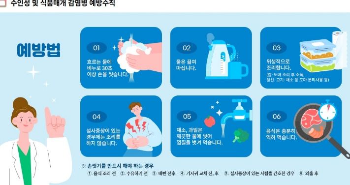 예방을 위해서는 ▲올바른 손씻기 생활화 ▲음식 충분히 익혀 먹기 ▲물 끓여 마시기 ▲설사 증상 시 음식 조리 금지 ▲위생적인 조리 환경 유지 등 개인위생 수칙을 철저히 지켜야 한다.