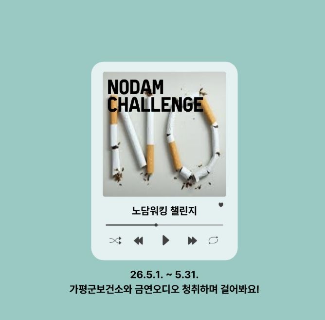 한방통신사 신유철기자 기자 | 가평군보건소가 ‘세계 금연의 날’을 앞두고 5월 1일부터 한 달간 금연 인식 확산을 위한 ‘노담워킹 챌린지’를 진행한다. 이번 행사는 일상 속 걷기 실천과 금연 홍보를 병행해 군민들의 건강한 생활 습관 형성을 돕고자 마련됐다.