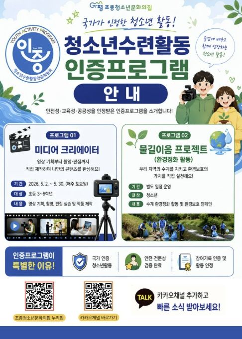 조종청소년문화의집 관계자는 “이번 인증은 프로그램의 질적 수준과 공신력을 확보한 중요한 계기”라며 “앞으로도 청소년이 주도적으로 성장할 수 있는 다양한 프로그램을 개발하겠다”고 밝혔다.