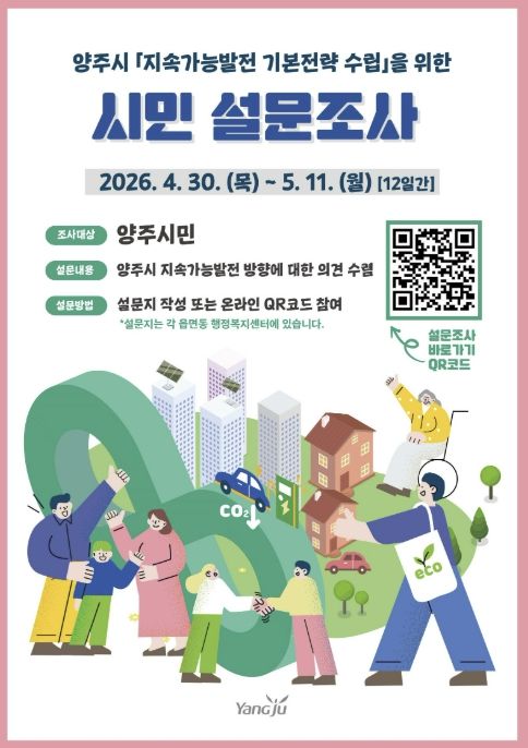 설문조사는 오는 4월 30일부터 5월 11일까지 12일간 진행되며, 양주시민이라면 누구나 큐알코드를 통한 온라인 조사와 설문지를 통한 오프라인 조사에 참여할 수 있다.