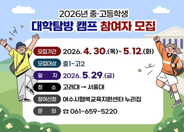 한방통신사 신다은기자 기자 | 여수시는 오는 30일부터 관내 중학교 1학년부터 고등학교 2학년 학생들을 대상으로 ‘2026년 중·고등학생 대학 탐방 캠프’ 참여자를 모집한다.