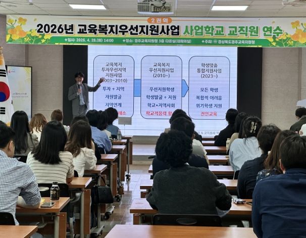 한방통신사 신유철기자 기자 | 경상북도경주교육지원청은 2026년 4월 28일 경주교육지원청 다온실(3층 대회의실)에서 ‘2026년 교육복지우선지원사업 2권역 사업학교 교직원 연수’를 개최했다.