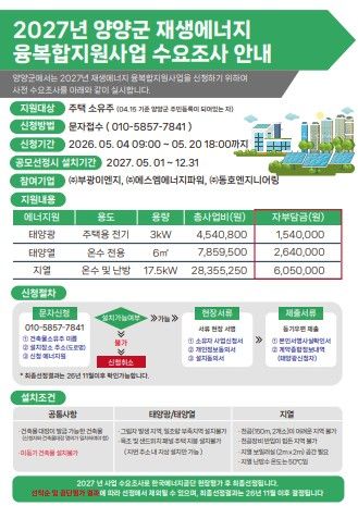 한방통신사 양호선기자 기자 | 양양군이 에너지 비용 절감과 온실가스 감축을 위한 ‘2027년 신재생에너지 융복합지원사업’ 공모 신청을 위해 오는 5월 4일부터 20일까지 사업 참여 희망자를 모집한다.