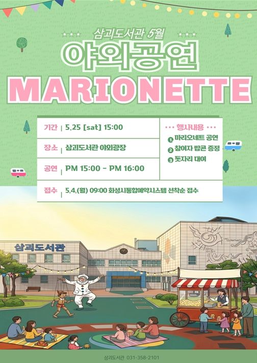 같은 날 '삼괴도서관 팝콘데이'를 운영해 야외광장을 방문하는 이용자들에게 무료 팝콘을 제공한다. 공연과 함께 즐기는 먹거리는 가족 단위 이용자들에게 더욱 풍성한 즐거움을 더하며, 봄날의 도서관 야외 공간을 한층 활기차게 만들 예정이다.