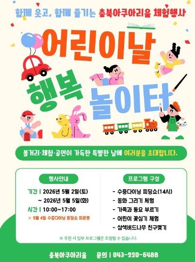 한편, 모든 프로그램은 현장 참여 방식으로 운영되며 세부일정은 충북아쿠아리움 홈페이지(sns포함) 및 현장에서 확인 할 수 있으며, 정기 휴관일인 5월 4일에도 정상 운영할 예정이다.