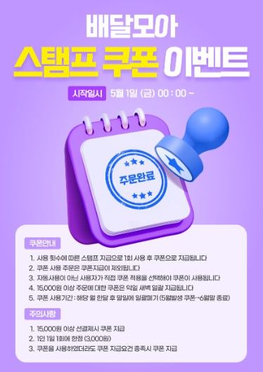 이번 이벤트는 5월 1일부터 배달모아 이용자 선착순 5,000명을 대상으로, 다음 주문 시 사용할 수 있는 3,000원 할인 쿠폰을 지급하는 방식으로 운영된다.