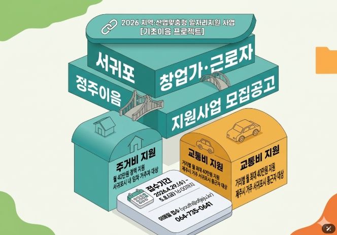 한방통신사 신유철기자 기자 | 제주특별자치도와 제주콘텐츠진흥원(원장 강민부)은 고용노동부와 함께 서귀포시 창업 생태계 활성화와 우수 인력의 안정적인 지역 정착을 위해 '2026 서귀포 창업가·근로자 정주이음 지원사업' 참여자를 모집한다.