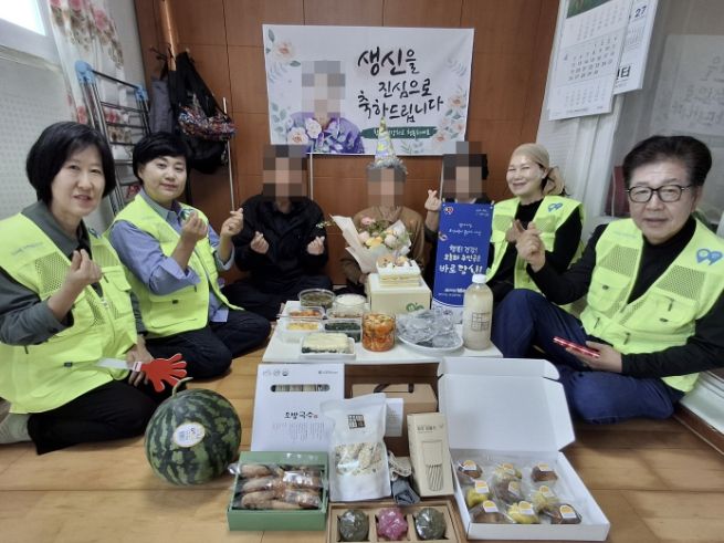 꽃다발과 생신상을 전달하고 따뜻한 담소를 나누며 정서적 지지를 이어갔다. 생신상에는 정미경 단장·여순남 단원이 준비한 미역국·밥·떡·물김치, 이진용 시전4리 이장이 준비한 수박, 김진회 도고면장이 직접 만든 반찬 4종이 올랐다. 아산시사회적기업협의회 참여기업 11개 업체도 케이크·생활용품·식료품 등을 후원하며 온정을 보탰다.