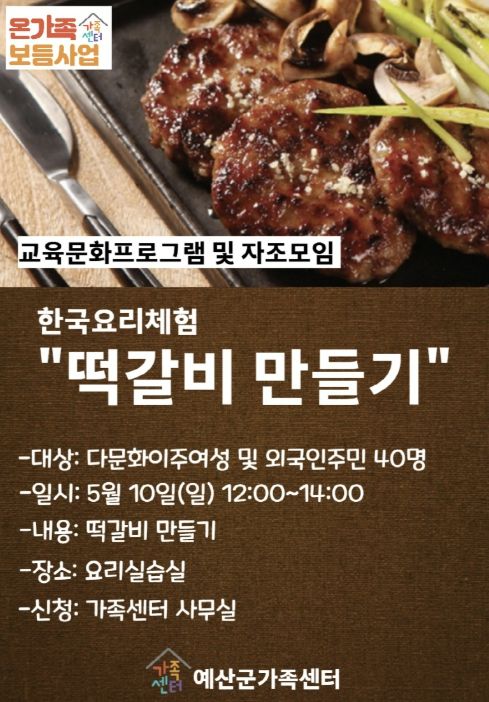 한방통신사 신태공 기자 | 예산군가족센터는 지역 내 결혼이주여성과 외국인 주민의 한국문화 이해 증진과 안정적인 정착 지원을 위해 오는 5월 10일 한국전통요리 체험 ‘떡갈비 만들기’ 프로그램을 운영한다고 밝혔다.