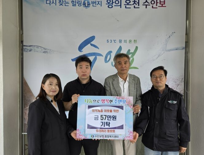 양병운 수안보면 지역사회보장협의체 위원장은 “따뜻한 나눔을 실천해 주신 배재범 대표님과 ‘우리끼리 동호회’ 회원들께 진심으로 감사드린다”며 “기탁된 성금이 지역 내 어려운 이웃들에게 큰 힘이 될 수 있도록 대상자 발굴과 복지 지원에 최선을 다하겠다”고 말했다.