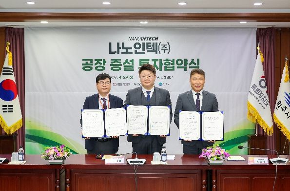한방통신사 양호선기자 기자 | 원주시와 강원특별자치도는 지난 29일 김문기 원주시장 권한대행, 심원섭 강원특별자치도 산업국장, 박병호 나노인텍㈜ 대표이사 등이 참석한 가운데 나노인텍㈜ 공장 증설을 위한 투자협약을 체결했다.