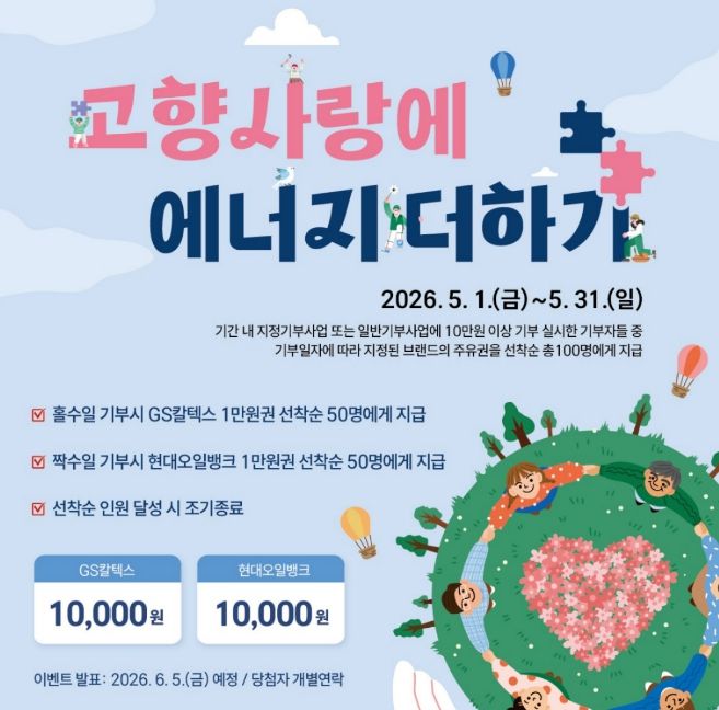 이번 이벤트는 5월 1일부터 31일까지 진행되며, 기간 내 지정기부사업인 ‘청소년밴드 동아리 활성화 지원사업’ 또는 일반기부사업에 10만 원 이상 기부한 기부자가 대상이다.