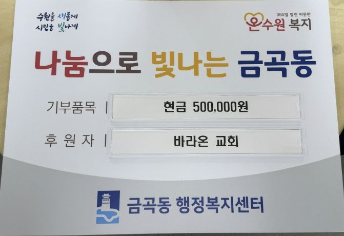 한방통신사 신유철기자 기자 | 수원시 권선구 금곡동 행정복지센터는 관내 바라온교회에서 조손가정을 위한 성금을 후원받았다고 밝혔다.