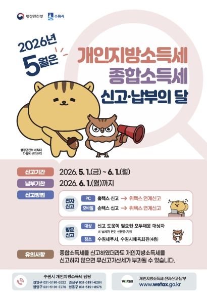 한방통신사 신유철기자 기자 | 수원시 장안구는 2026년 개인지방소득세 신고·납부의 달을 맞아, 지난해 12월 31일 기준으로 장안구 내 주소지를 둔 개인은 5월 1일부터 6월 1일까지 개인지방소득세를 신고·납부해야 한다고 밝혔다.