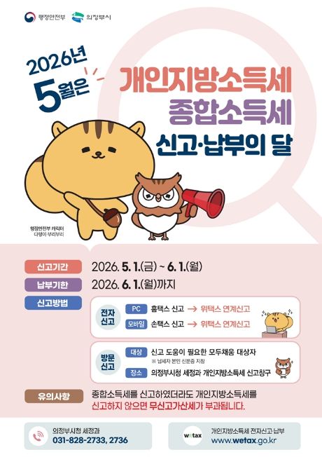 한방통신사 신유철기자 기자 | 의정부시는 5월 개인지방소득세 및 종합소득세 확정신고 기간을 맞아, 5월 6일부터 6월 1일까지 시청 본관 세무민원실에 신고 도움창구를 운영한다.