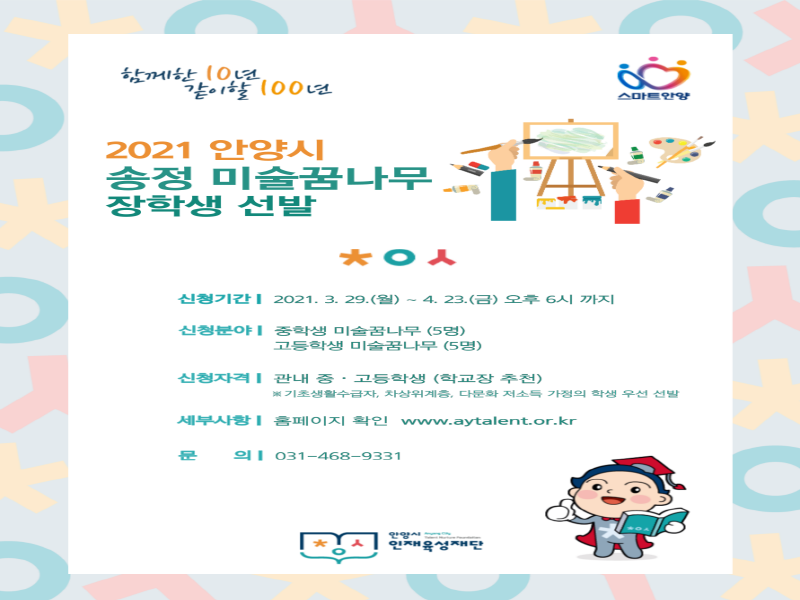 안양시 인재육성재단(이사장 최대호)이 「안양시 송정 미술꿈나무」 장학생을 선발한다.