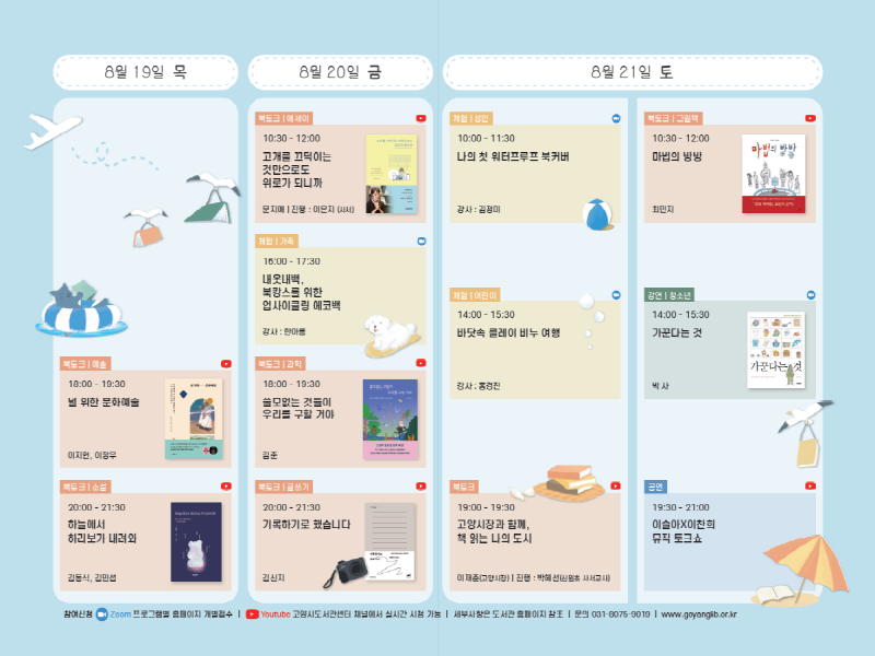 북토크와 공연은 유튜브 라이브로 고양시 도서관센터 채널을 통해 중계된다.
