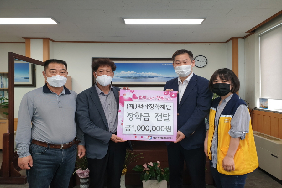 (재)백야장학재단(이사장 김병희)은 지난 17일 하성면의 지역 인재 육성을 위해 학업성적이 우수하고 효행심이 두터운 모범학생에게 전달해 달라며 장학금 100만원 전달하였다.