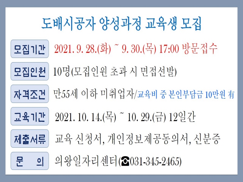 모집인원은 10명, 모집기간은 9월 28일부터 30일 17시까지이며 일자리센터로 방문접수하면 된다. 만55세 이하 미취업자로 관련분야 취ㆍ창업 희망자는 누구나 신청이 가능하며, 모집인원보다 접수인원이 많을 경우 면접을 통해 교육생을 선발할 예정이다.