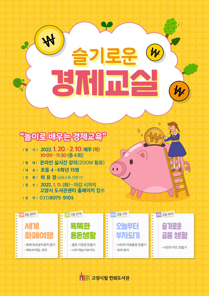 고양시(시장 이재준) 한뫼도서관은 겨울 방학을 맞는 어린이들을 위해 1월 20일부터 2월 10일 까지 총 4회에 걸쳐 실생활에 필요한 금융지식을 배우는「슬기로운 경제 교실」을 온라인으로 운영한다.어린이들의 눈높이에 맞춘 ‘놀이로 배우는 금융교육’은 초등 4~6학년 15명을 대상으로 운영된다. 금융교육 전문가 허유경 강사가 진행한다.