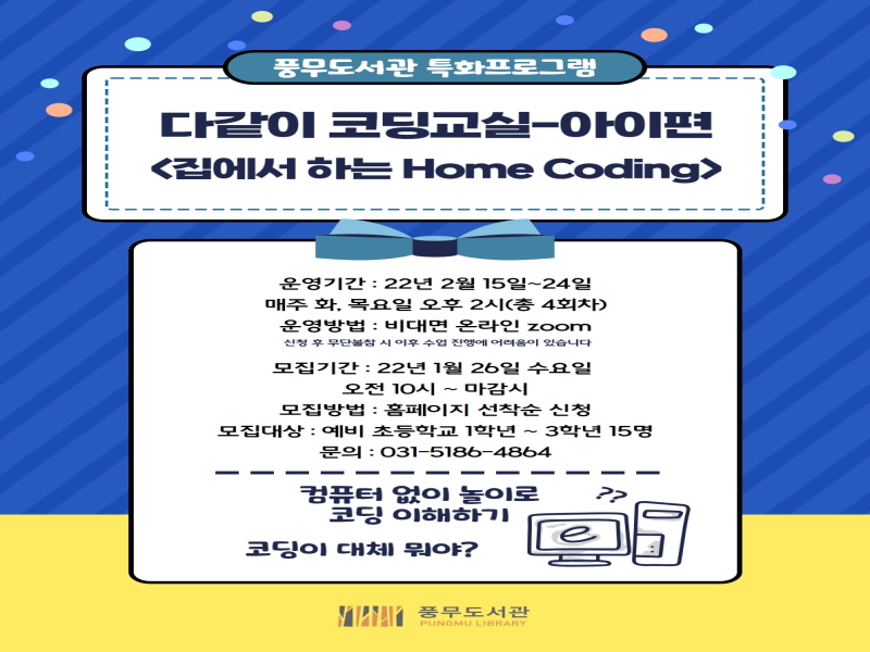 김포시 풍무도서관은 2022년 새학기를 맞아 초등학생들을 위한 특화프로그램 「다같이 코딩교실-아이편」 강의를 운영한다.