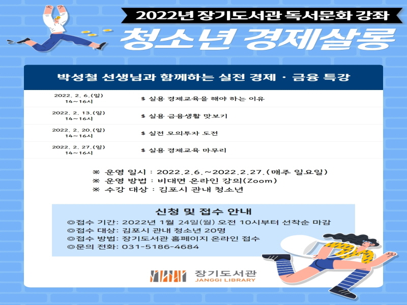 김포시 장기도서관은 2022년 2월 6일부터 2월 27일(매주 일요일) 오후 14시부터 16시까지 총 4회에 걸쳐 김포시 청소년을 대상으로 「청소년 경제 살롱」 강연을 운영한다.
