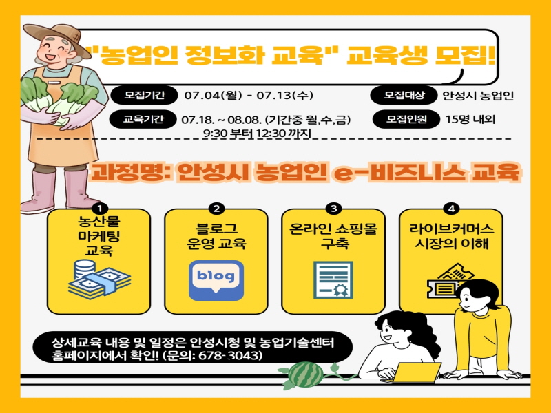 안성시농업기술센터는 7월 4일부터 13일까지 농업인 정보화 능력 강화를 위한 「안성시 농업인 e-비즈니스 교육」 교육생을 모집한다.